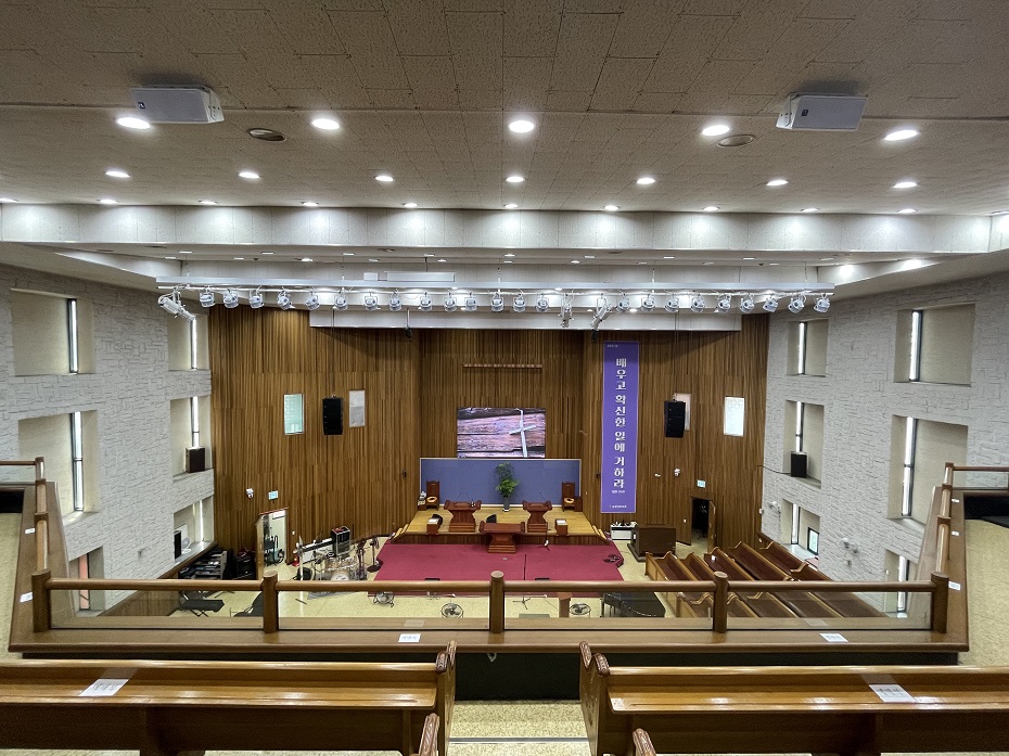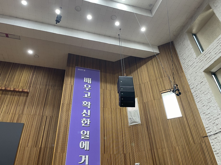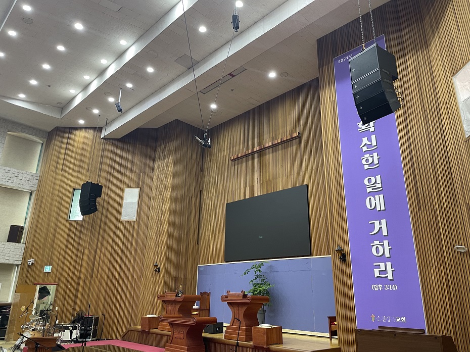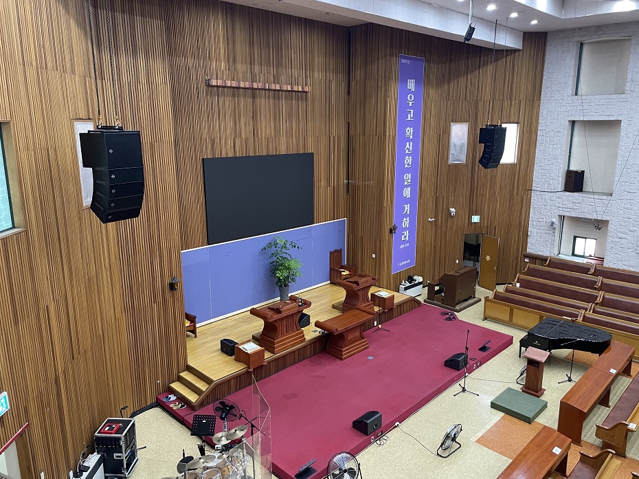함께 시공된 무대용, 설교자용으로 컴팩트한 모니터 스피커들도 보입니다.